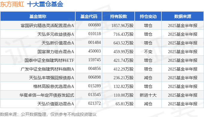 执有东方雨虹最多的基金为富国筹商精选纯真成立混杂A,当今范围为6.99亿元,最新净值2.767(7月31日),较上一交夙昔着落2.54%,近一年高潮14.2%。该基金现任基金司理为刘莉莉。