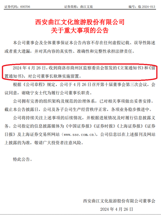 曲江文旅4月26日晚公告,当日收到商洛市商州区监察委员会签发的《立案告知书》和《留置告知书》,对公司董事长耿琳实施留置。凭证《公司端正》章程,公司于4月26日召开第十届董事会第三次会议,会议甘心,在董事漫空白本领,由公司董事、总司理兼财务总监谢晓宁代为执行公司董事长职责。